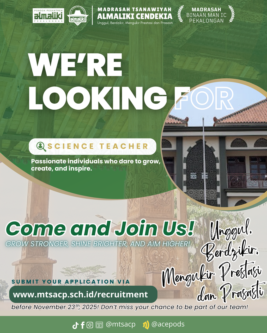 MTs Almaliki Cendekia membuka kesempatan bergabung bagi insan pendidik yang berdedikasi tinggi, berakhlak mulia, dan memiliki semangat untuk mencerdaskan generasi Islam yang berilmu dan berkarakter.
